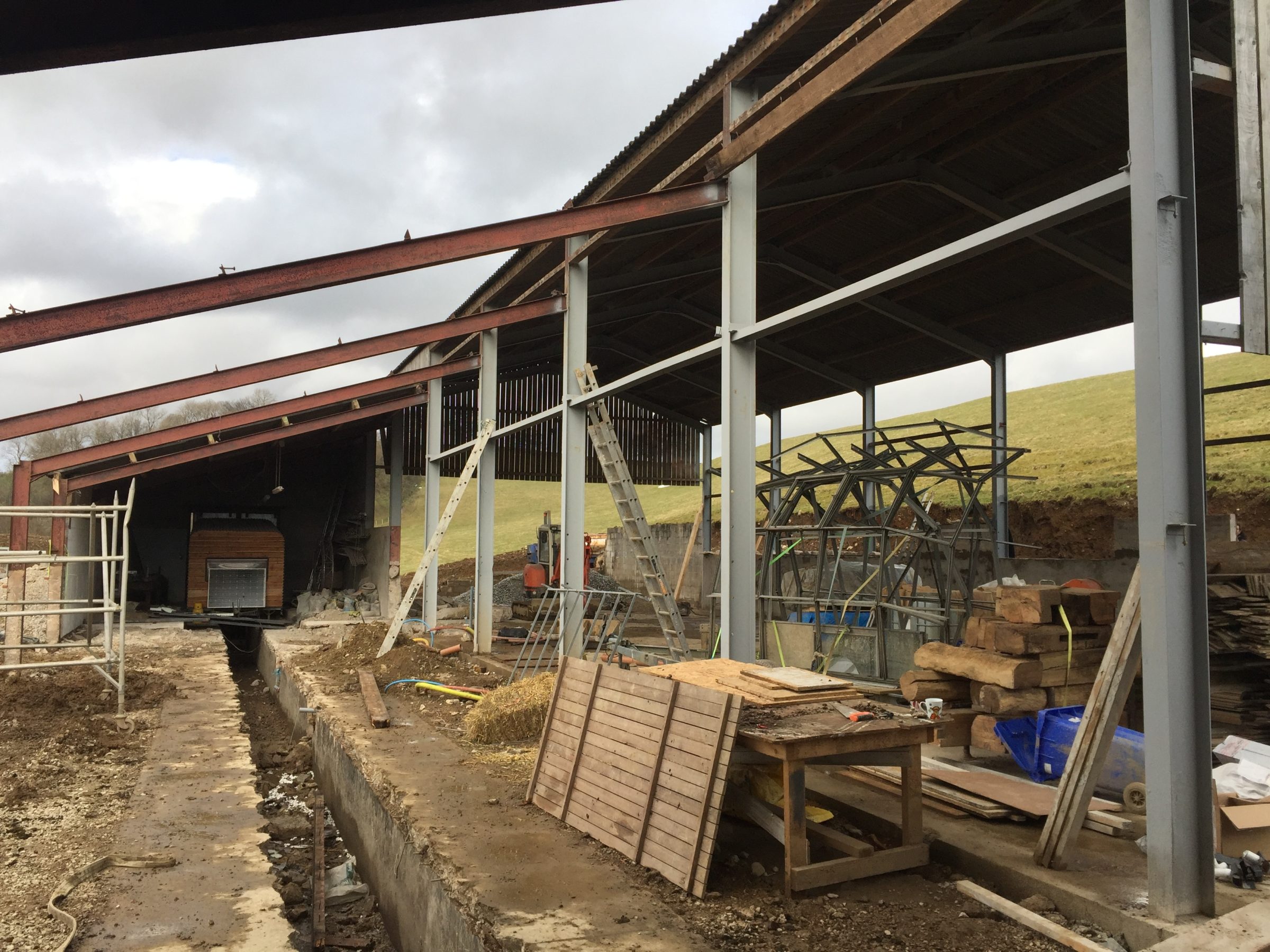 As part of the development, we retained ownership of the 1980’s built steel-framed hay barn and lean-to cow shed and it became storage space and workshops for the next few years.